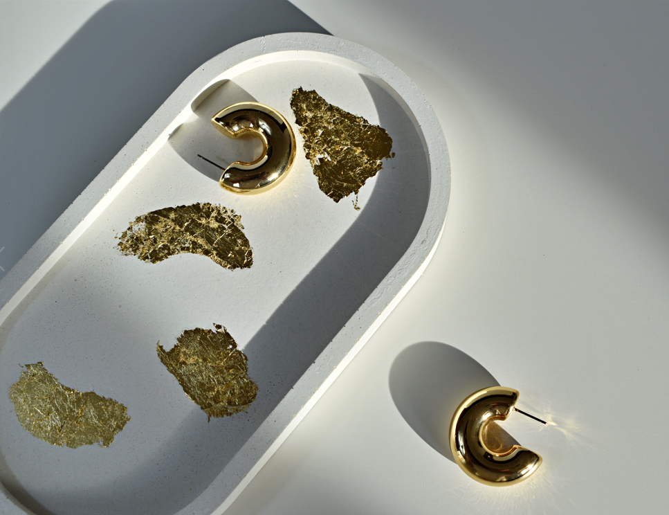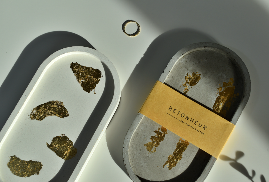 L’ iconique plateau ovale Choumie en version béton et feuille d’or.